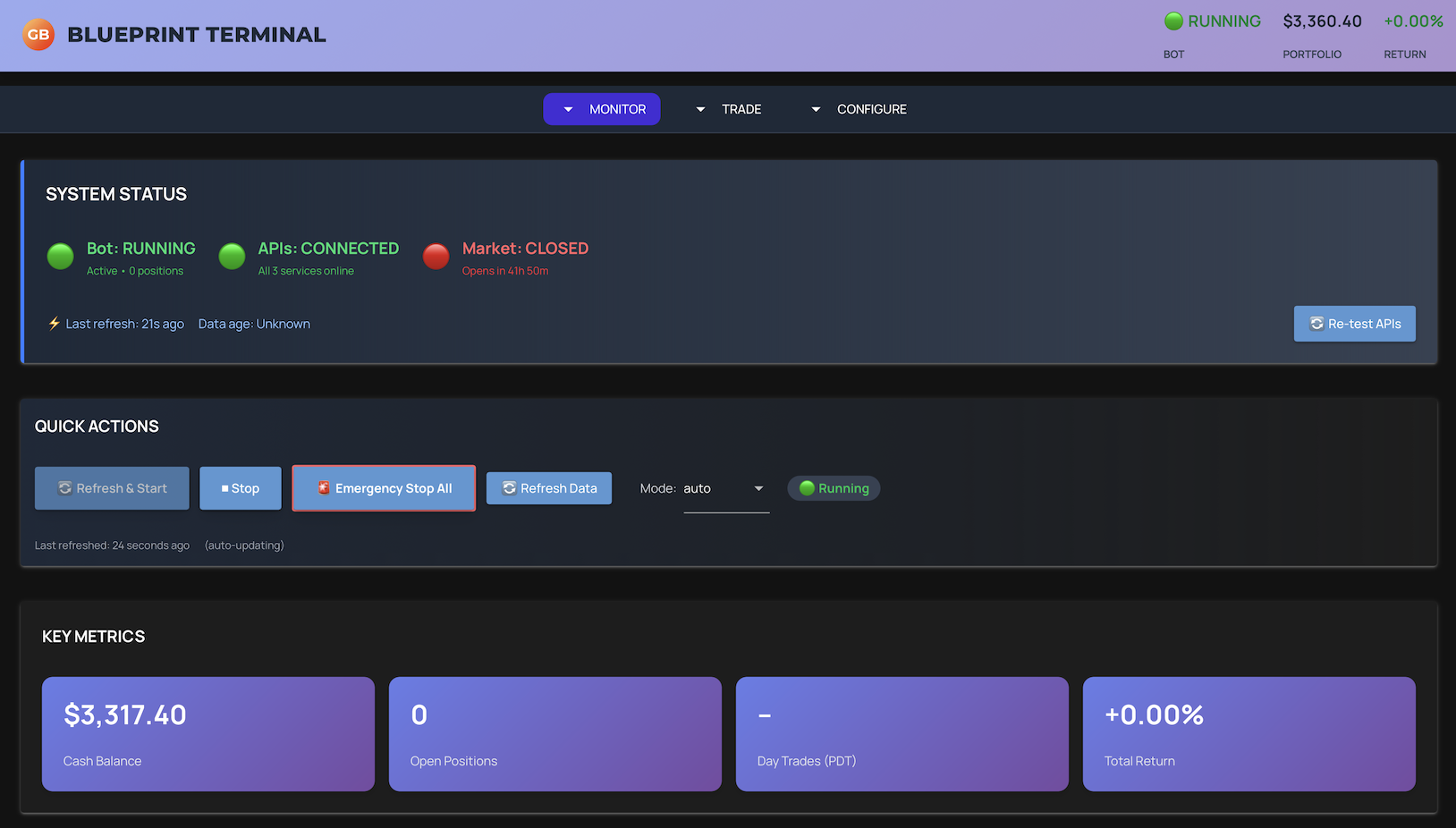 Blueprint Terminal executes trades automatically based on your daily trade settings. We recommend starting in manual mode so you get comfortable with how the system works; once you are ready, automation runs for you. Your data and keys stay on your machine.